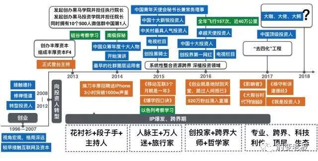 我之所以对IP的认知越来越深刻,是因为今年有件事极大的震撼了我。 在过去的两年,我曾多次在公开场合说过“晚上舍不得睡,早上不得不起,睡觉也是一种浪费”。但是我这话说了两年,一直没火起来。 就在今年春天,日本软银孙正义先生,在全球最大的单项基金(规模1000亿美金)的成立大会上说“未来的智能互联时代,睡觉也是一种浪费”,这句话一下子就火了,可以说是在全世界刷屏了。这就说明了一个“人名”和“名人”的严重区别,更可以说这是一个“小 IP ”和一个“超级 IP ”的严重区别。 就是这两件事,让我更加坚定了打造个人IP的信心,因为我深谙 IP 的力量太强大了。我个人是一个小 IP ,在过去几年里,得益于偶然或是必然的成长,即便是小 IP 也让我感受到了力量和价值。 下面,我就首次为大家揭秘我的“ IP 成长树”,这是 IP 领域的首创。 我的“ IP 成长树” 02 “ IP 成长树”就是我们一起以 IP 为主线,画一画自己的人生地图,写一写我们的人生使用手册,记录下人生每个阶段的关键词。 企业家 IP 简单说就是个人品牌。 而品牌,就是占据消费者心智空间的能力,简单说也就是他一想到你,就能想到什么。 人生一系列的经历轨迹成就了我今天的性格基因,然后我在这个性格基因的基础上,去延长,做出今天的 IP 。 这就是“ IP 的成长树”。以我为例,我把自己的 IP 成长树分为三个阶段。 第一阶段: 2012年之前,也就是「IP前传」。 在 2012 年之前,我对 IP 这件事只有星星点点的认知,举个例子,我最核心的 IP 标签就有从那时候就开始的“投资花衬衫”和“创投段子手”。 为了把“投资花衬衫”这个标签贴实,我的衣服,除了工作服全都是花衬衫,从量变到质变。那会有人问是不是所有人都可以穿花衬衫?不然,只有我独特沧桑的人生经历才能让我驾驭花衬衫。 所以说给个人品牌做定位、贴标签这件事,是跟自己的人生基因有关系的。成功的背后不是肮脏就是沧桑,我不肮脏只能沧桑,只有把强大的内心和厚重的智慧进行沉淀才能驾驭,要不然就是“浮躁”和“花”的代名词。 所以说,要成为怎样的 IP ,是跟你的成长经历、人生基因和甚至你的人格有直接关联的,同样也是「你要成为怎样的 IP 」最核心的根基。 这也是我在“杨十条”中一条是「未来的人生只与高手过招」的原因。 其实,人与人之间最大的差别就是思想和认知。只有于那些比你有更高思想的人交往、去和比你更有实力的人接触,相信一句话——与高手过招你才能越来越高。 不管是创业还是投资,跟谁在一起很重要,俗话说得好,土豆拉一车不如夜明珠一颗。只交“生意上互助,生活中互动,生命中互爱”,有高度、有价值、有意思的朋友。 [ 坚持 6:3:1 原则 ]: 人生的 60% 的时间,去跟影响你人生、对你人生有价值的 10% 的人在一起;花 30% 的时间,去跟经常与你有互动的 30% 的人交流;剩余 60% 的人,如果你们的生命中有没有彼此都不重要,那么只需花10%的时间去维系。 这是一个倒置逆反的、人脉资源的经营法则。 在人的一生中,对你最重要的人大概只有 10 个左右,你的生命质量发展如何,很大程度上受这 10 多个人的影响。你只要把这 10 个人找出来,与他们互动,圈子对了人生就对了。 一个人是否能把自己的事业做大、做强、做好,跟他遇到的人是直接相关的,所以说跟谁在一起实在太重要了。 很多人生经历都使我醒悟。高人开悟、贵人相助、内人相扶、对手鼓舞和小人绊路,想要取得大成,这些在你生命中都是不可或缺的。所有出现在你生命当中的人,都是来成就你和修炼你的。 所谓的“人脉”不是你认识多少人,而是你对多少人有价值、能创造多少被他人“利用”的机会、能创造多少为他人服务的机会。 第二个阶段: 2012—2017年,IP 养成期。 进入投资圈,我并不是盲目进入的,是有过认真设计的。这五年一路走来,不仅得益于众人的帮助和成就,还恰逢赶上了“双创”的大热潮,今天比我当初设计的走得更好,于是我更加感恩。 当年并没有 IP 这个概念,我要想转型做投资,就必须得有自己的特色,这才开始设计个人IP。我开始注重给自己身上贴“超级符号”(今天叫 IP 标签),超级符号其实就是超级品牌,我的第一个(超级符号)就是“丰厚资本 F4 ”。 我之所以给自己贴这个符号,是因为我刚进投资圈就发现,这是一个挺残酷的圈子,圈层已经基本形成。这实际上是个少数人的游戏,一个新来的想在这个圈子真正立足很难。 在逐步摸索前进的过程中,我发现了这个圈子三个特点: 第一,投资界的很多人已经很成功了,成为顶级大佬,乌云压顶,造了一层厚厚的天花板; 第二,投资的周期其实非常长,一般需要五年,在通过成功投资案例证明自己之前,就必须要打造 IP 创造影响力; 第三,其实绝大部分成功的投资人,都是从财务角度进行投资的,基本都没有创业经历。 刚进入这个行业,比实力和知名度肯定比不了。我曾在 2012 年年底做了一次闭关,对自己的过往做了梳理和定位,我发现有两个优点可以发挥出来,那就是这些投资人几乎没有真正创过业,我比他们更懂创业、更懂创始人,我要把优势发挥到极致。 我对两个理论有不同的理解: ①木桶理论:我们很反对木桶理论这个提法,今天,我们所有人都习惯拿着放大镜找自己身上的缺点。你拿自己一个人的缺点去跟所有优秀的人比,这你比不过来。补人生的短板和公司